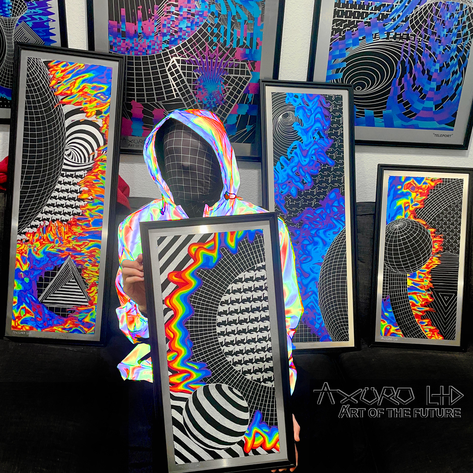 The aesthetics of Axuro LTD is defined by a fusion of optical illusions, color spectrums, and cymatic frequency distortions, often interwoven with wireframe figures and technological elements. Futuristic mediums like aluminum, electronics, and 3D printing have pushed his work into new territory, balancing precision with vibrant visual freedom. His work now also includes Axuro Lighting Co & Tattoos, further diversifying his creative reach. In 2025 he founded ALPACA, a small art collective built to encourage collaboration and shared creativity among local artists.