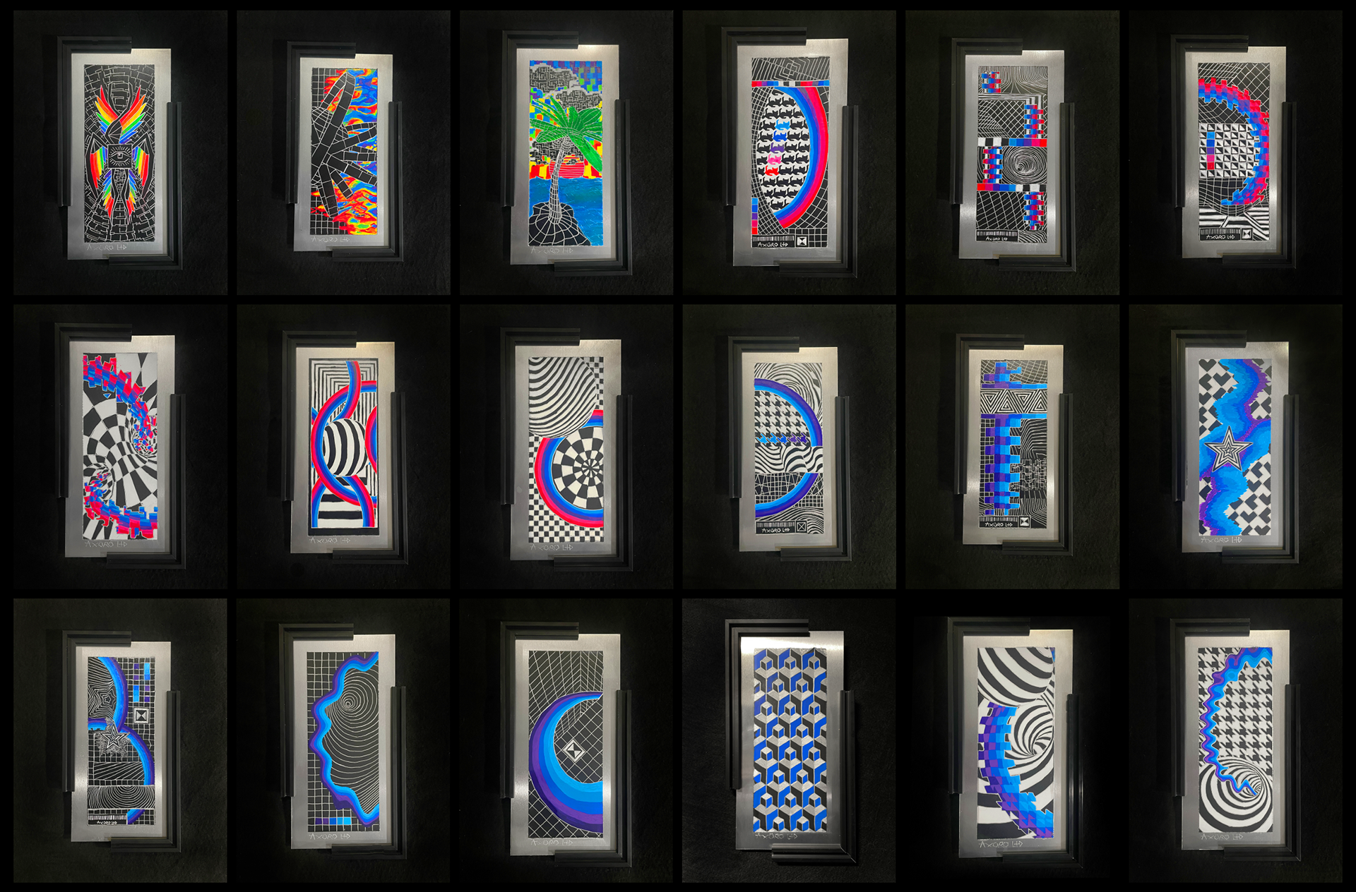 Today, Axuro LTD is defined by a fusion of optical illusions, color spectrums, and cymatic frequency distortions, often interwoven with wireframe figures and technological elements. Futuristic mediums like aluminum, DIY electronics, and 3D printing have pushed his work into new territory, balancing precision with vibrant visual freedom. With the addition of Axuro Lighting Co & Tattoos, diversification has created the stability needed to commit to art full-time. With that momentum came the beginning of ALPACA, a small but meaningful collective built to encourage collaboration and shared creativity among local artists.