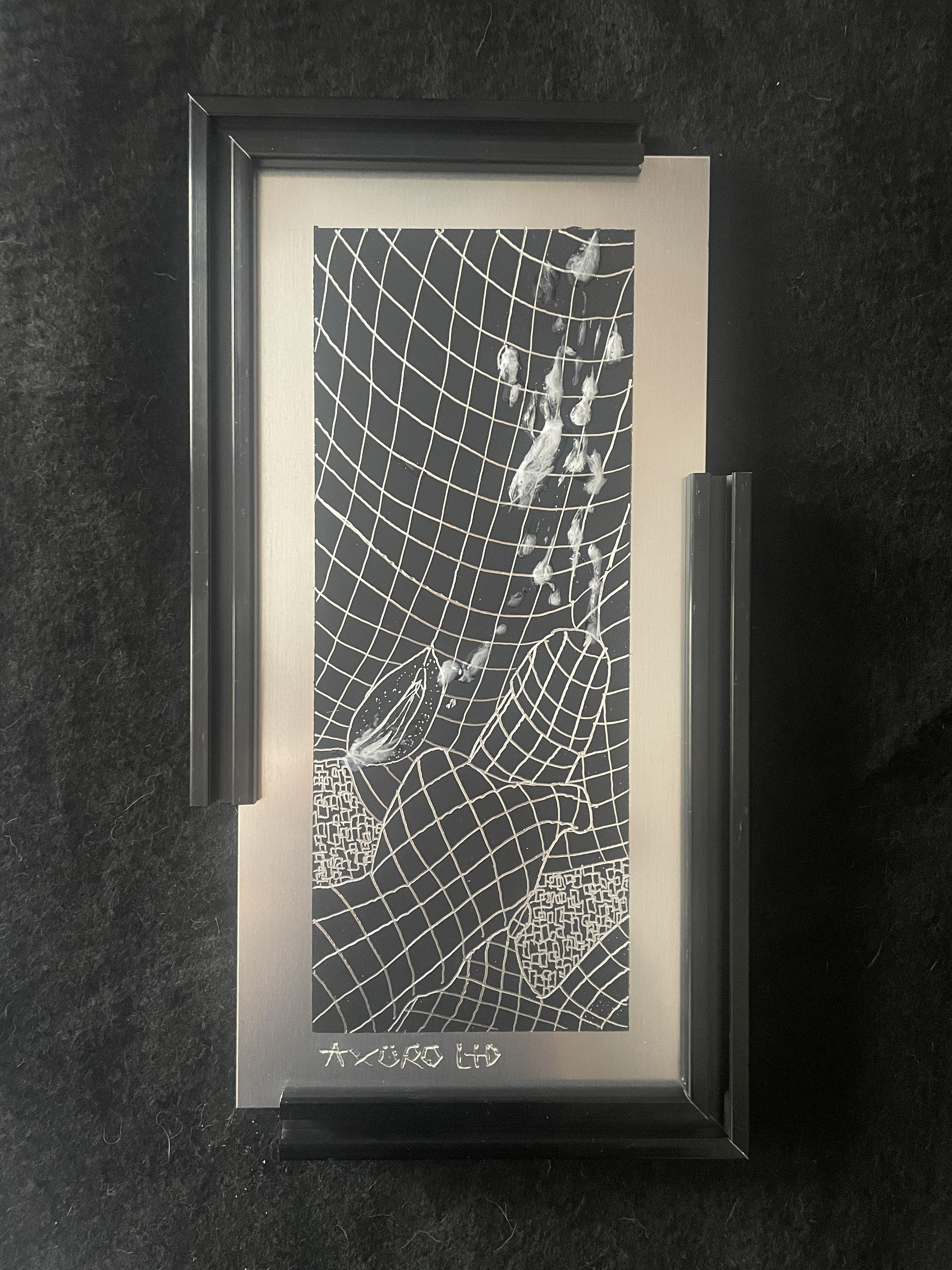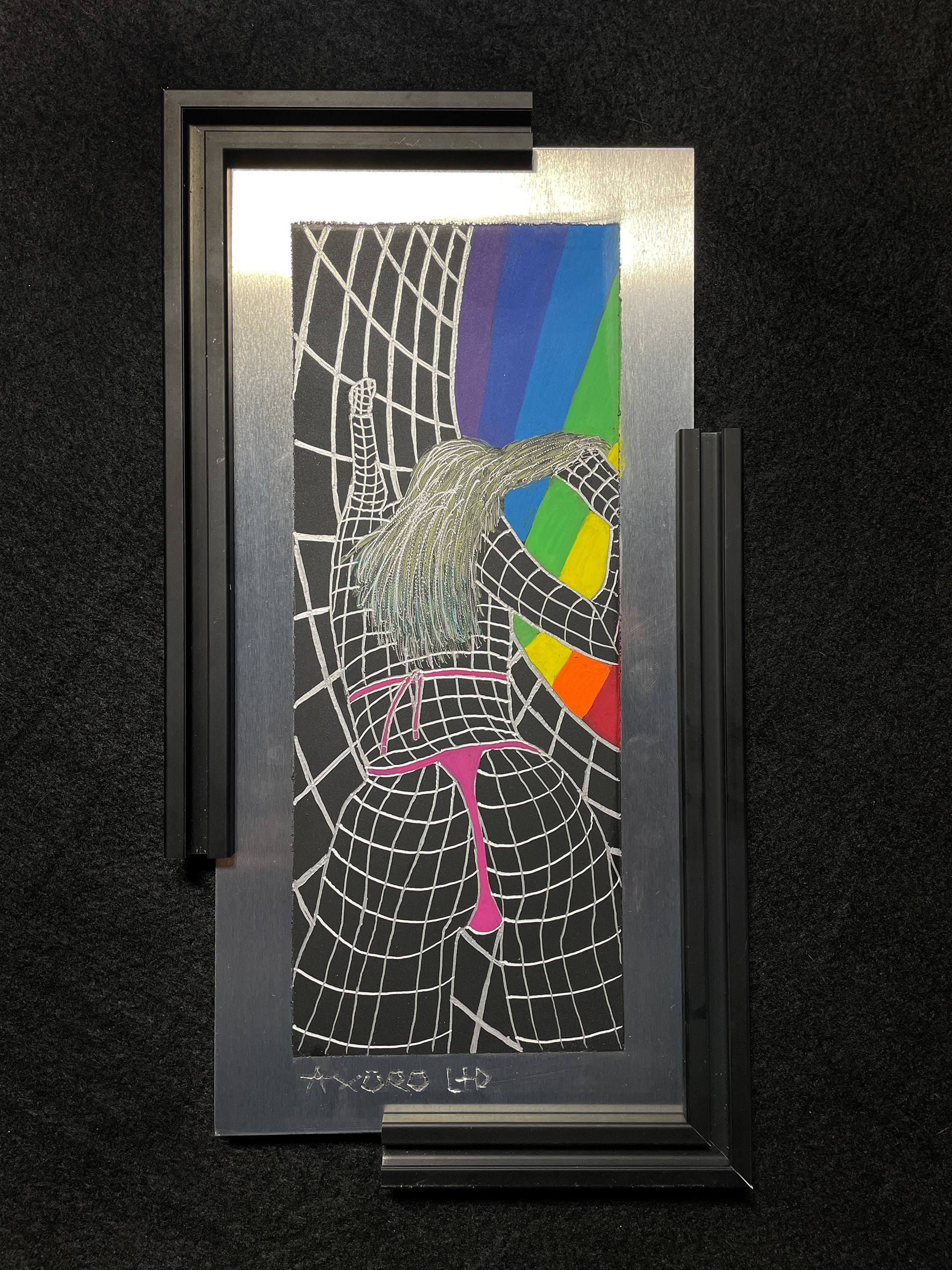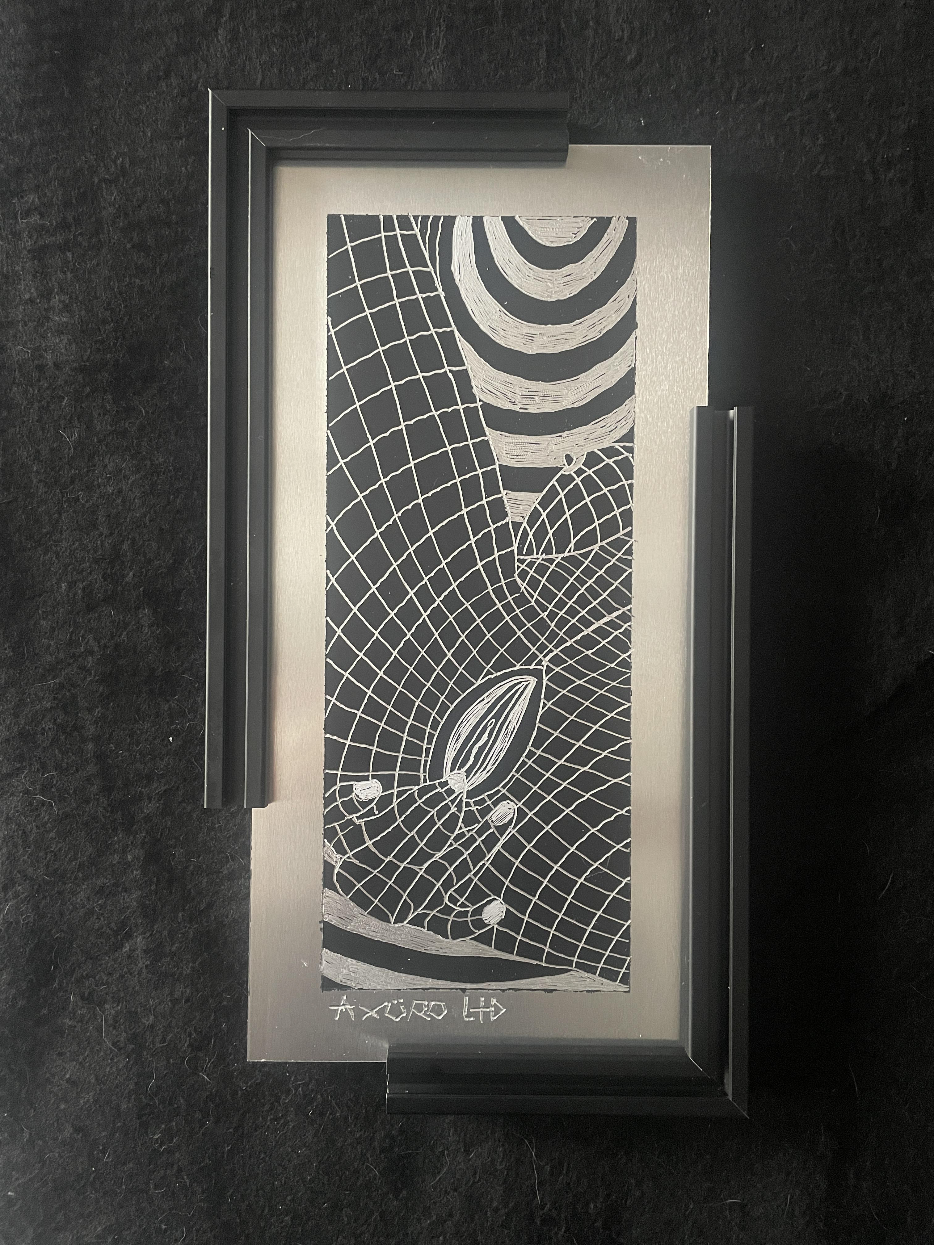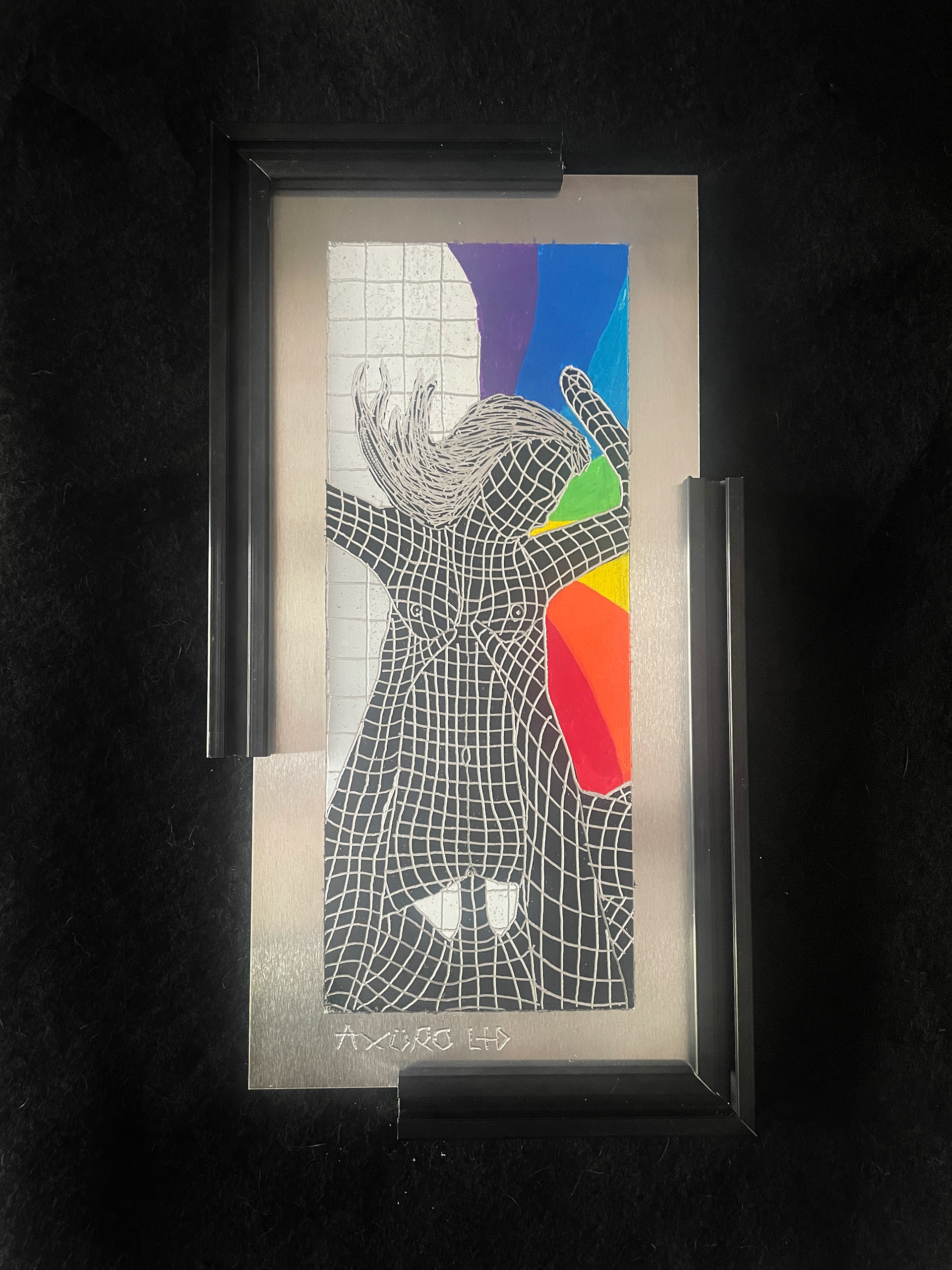 Artwork on 6"x12" aluminum panels made using spraypaint, paint markers, & hand engraving. Framed using aluminum extrusion.