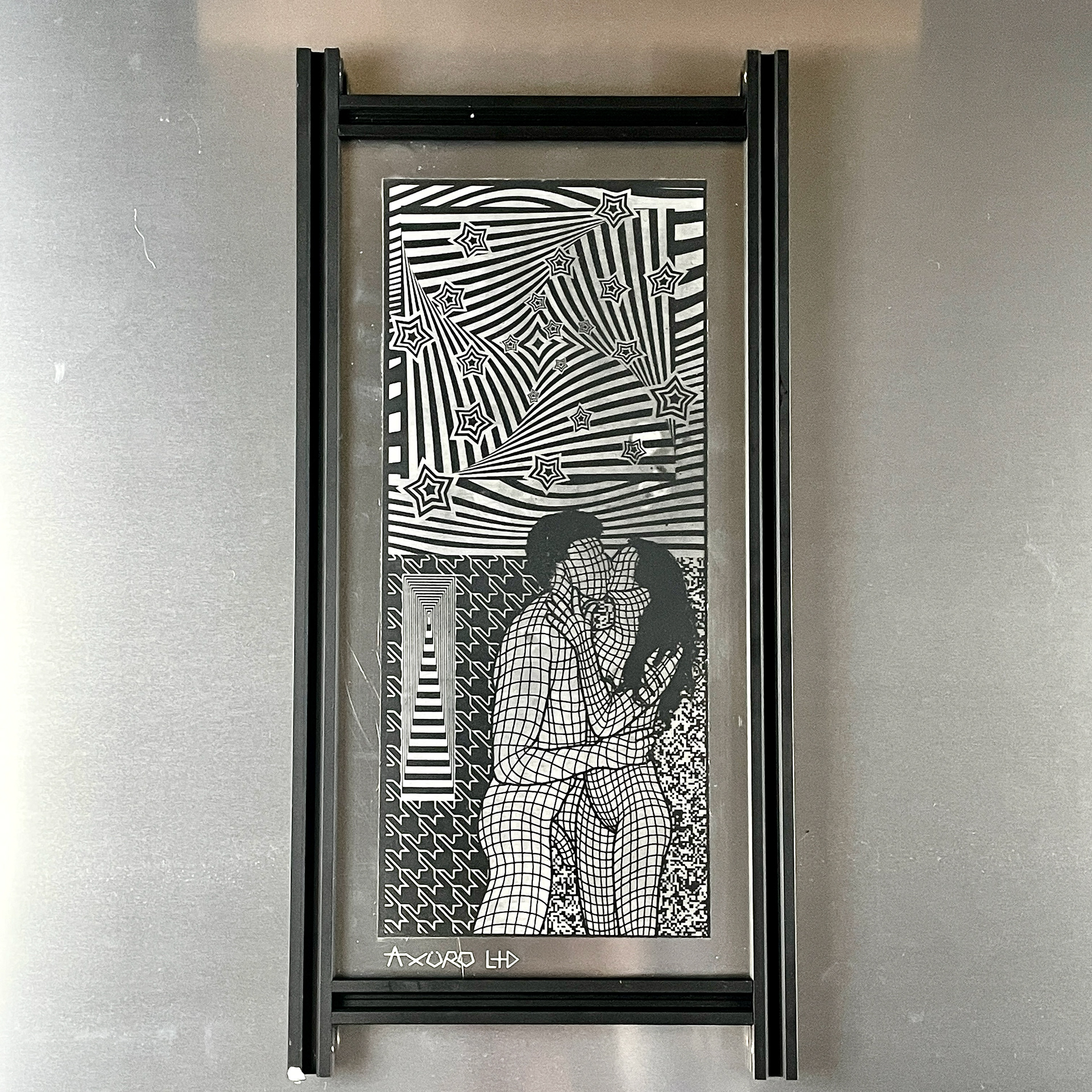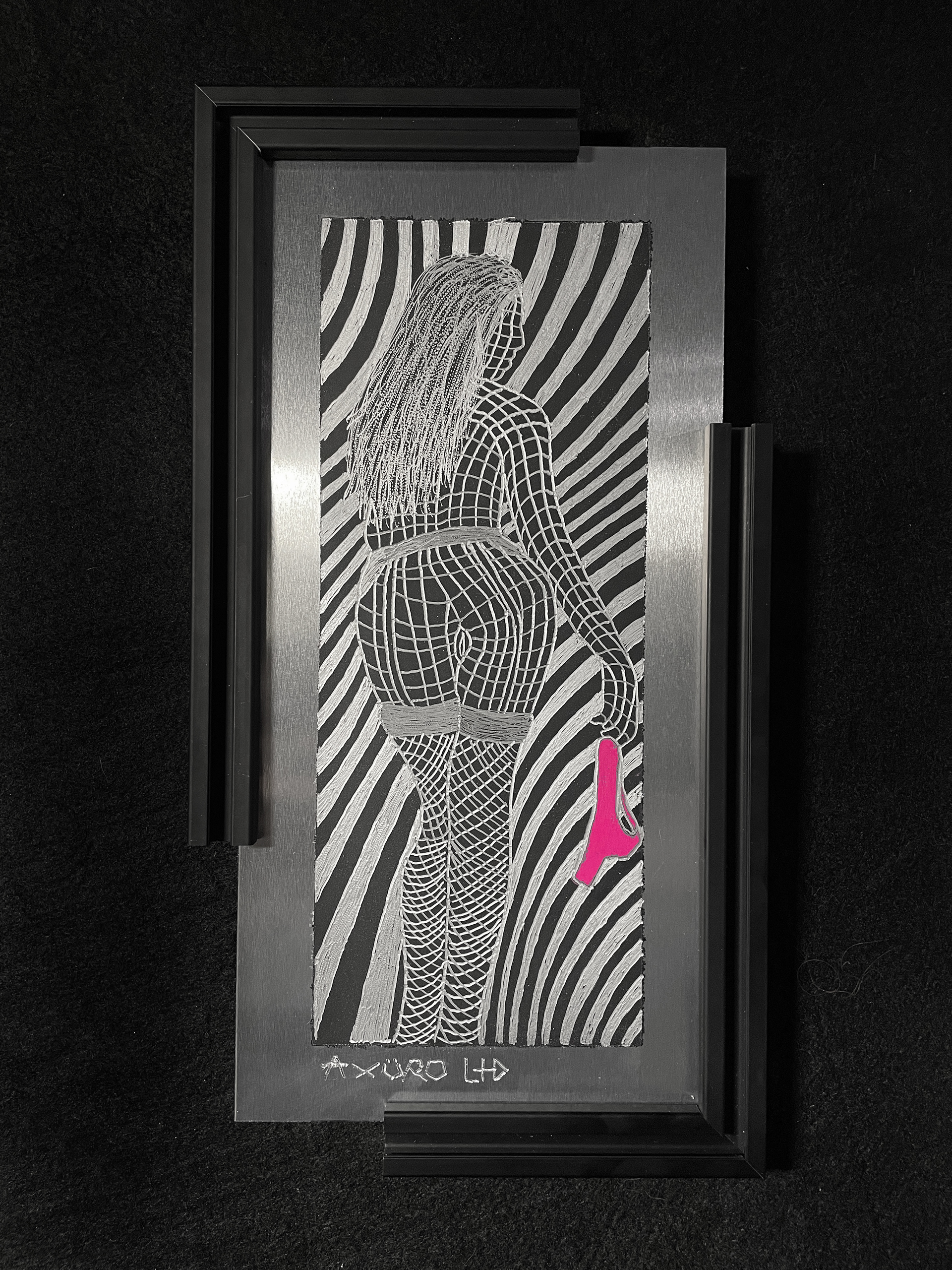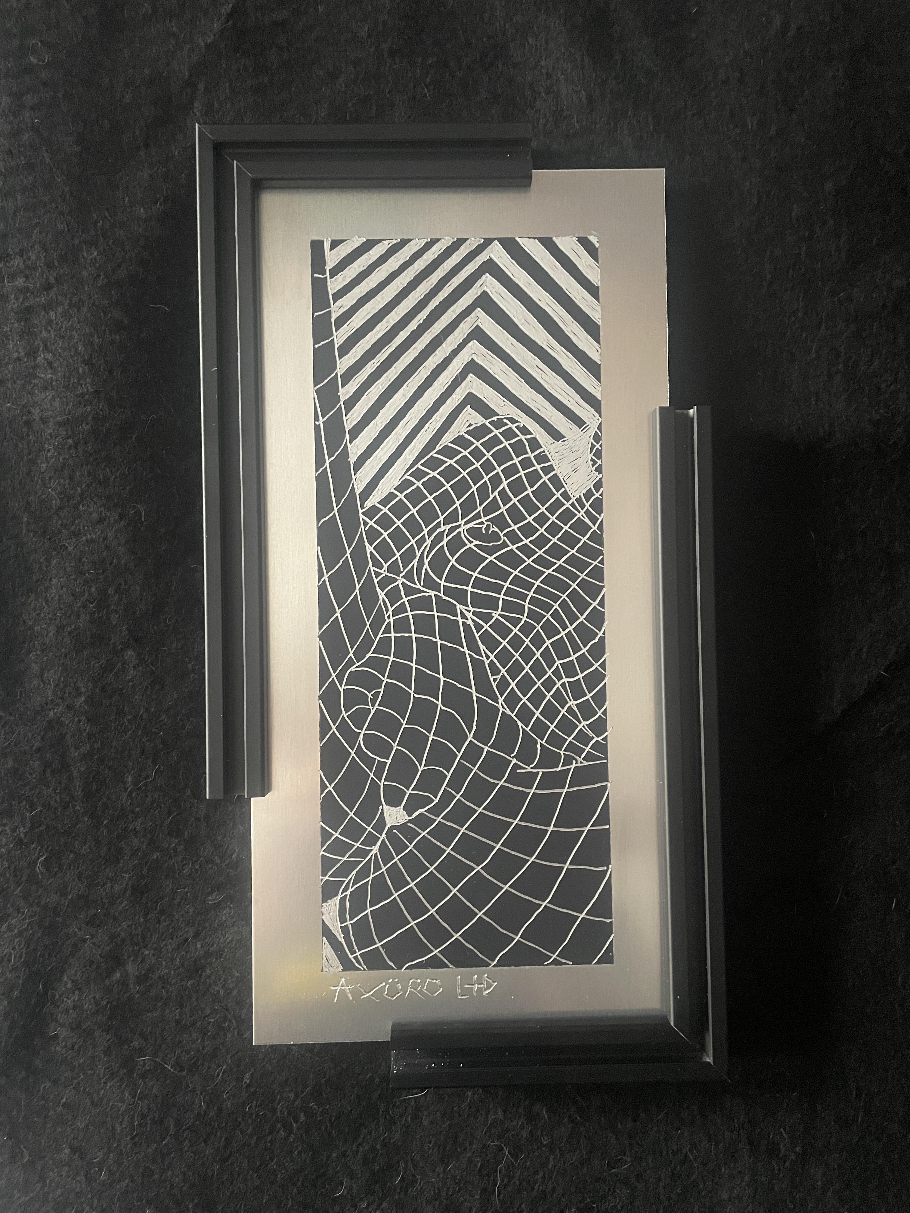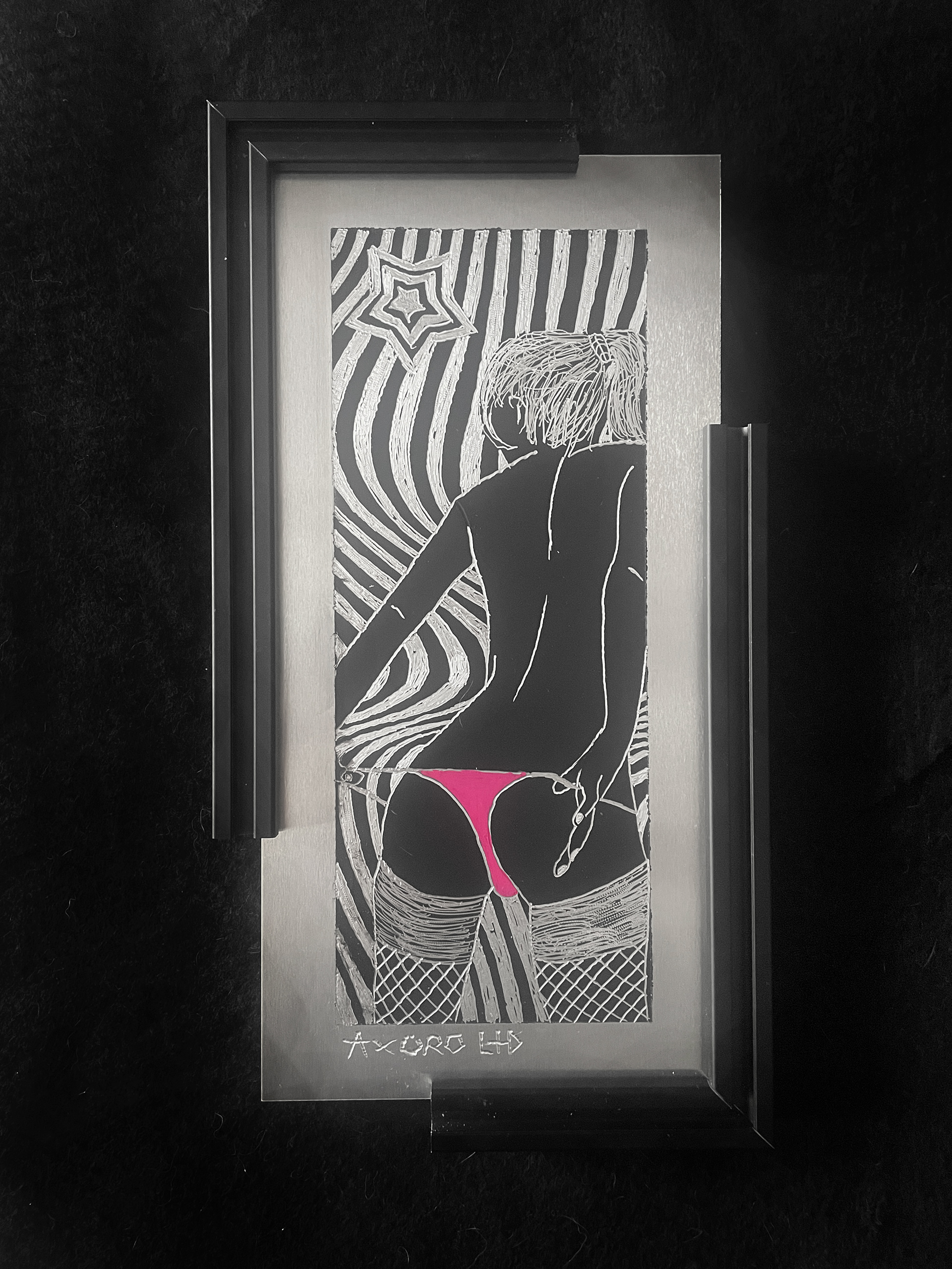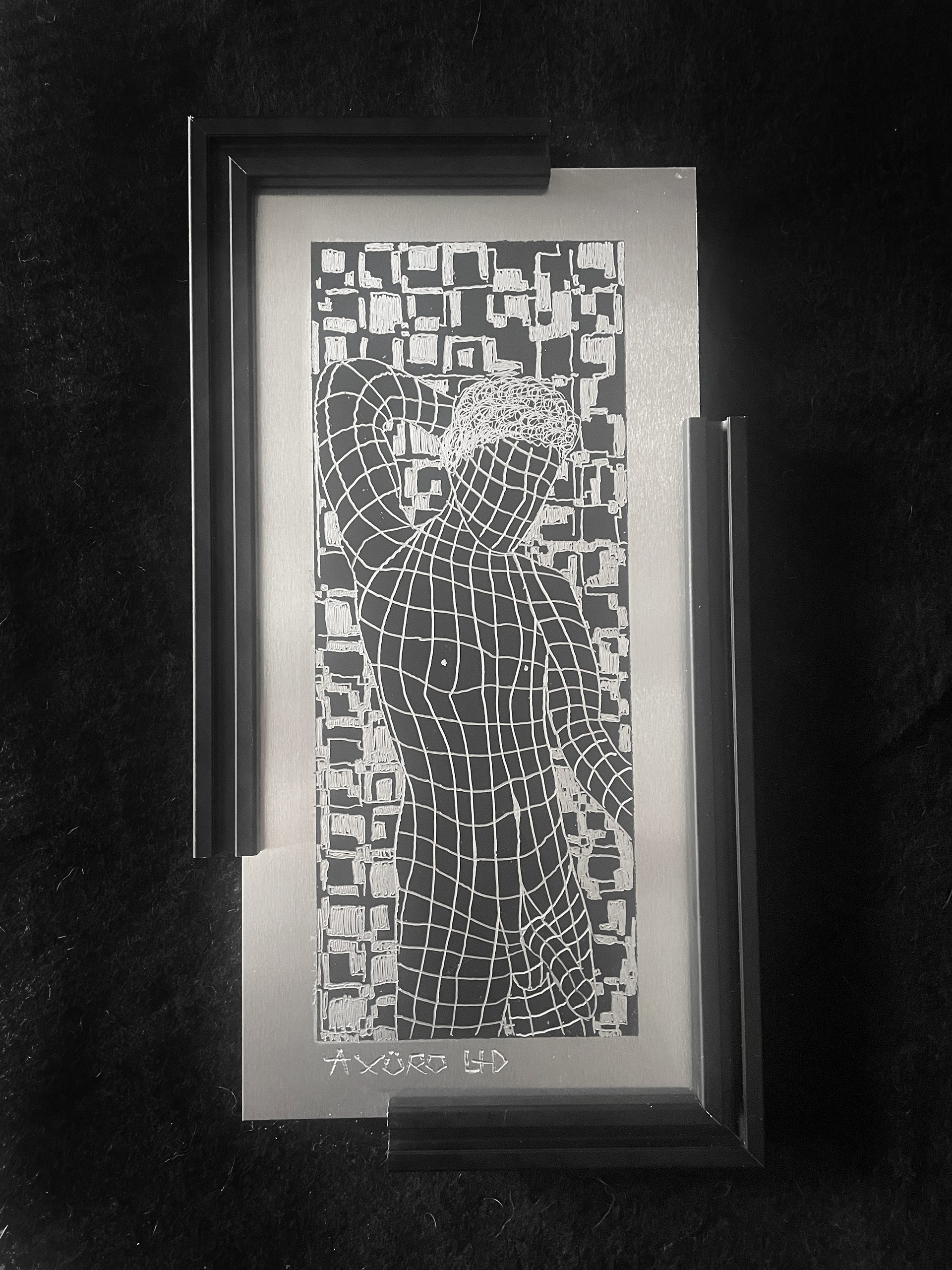 Artwork on 6"x12" aluminum panels made using spraypaint, paint markers, & hand engraving. Framed using aluminum extrusion.